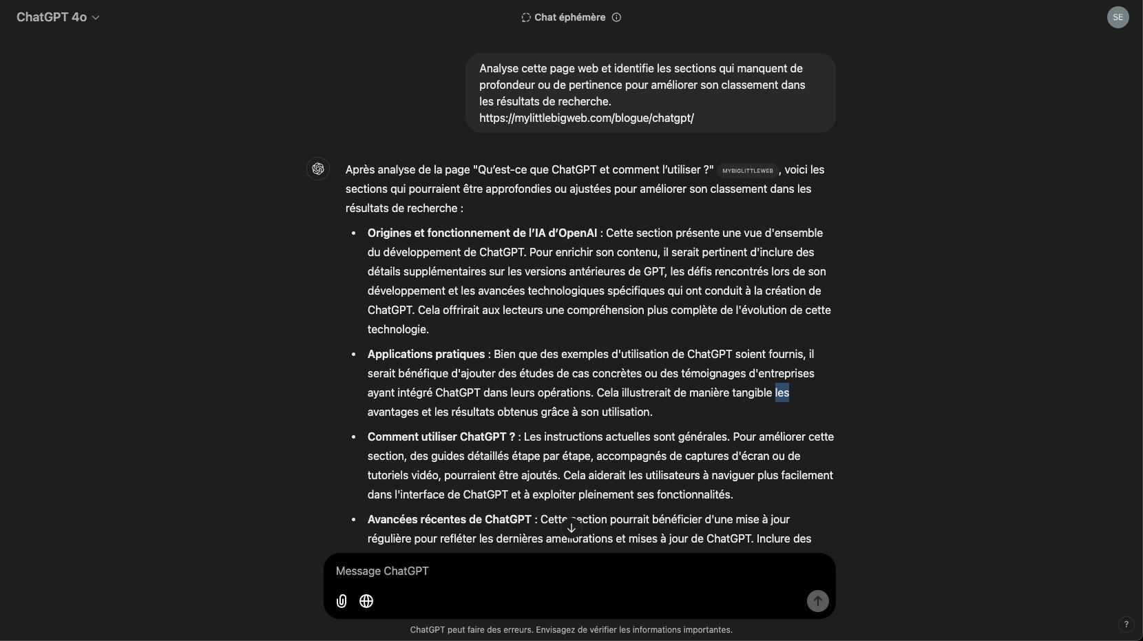 Prompt utile : « Analyse cette page web et identifie les sections qui manquent de profondeur ou de pertinence pour améliorer son classement dans les résultats de recherche. » Ce prompt est particulièrement utile notamment avec la sortie de SearchGPT.