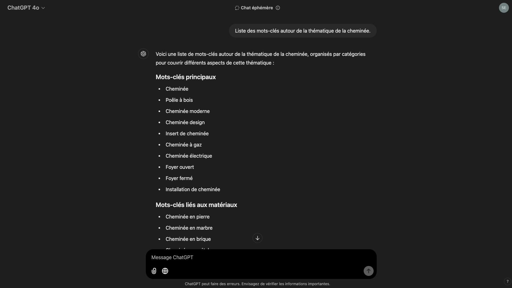 Prompt utile : « Liste des mots-clés autour de la thématique de la cheminée. »