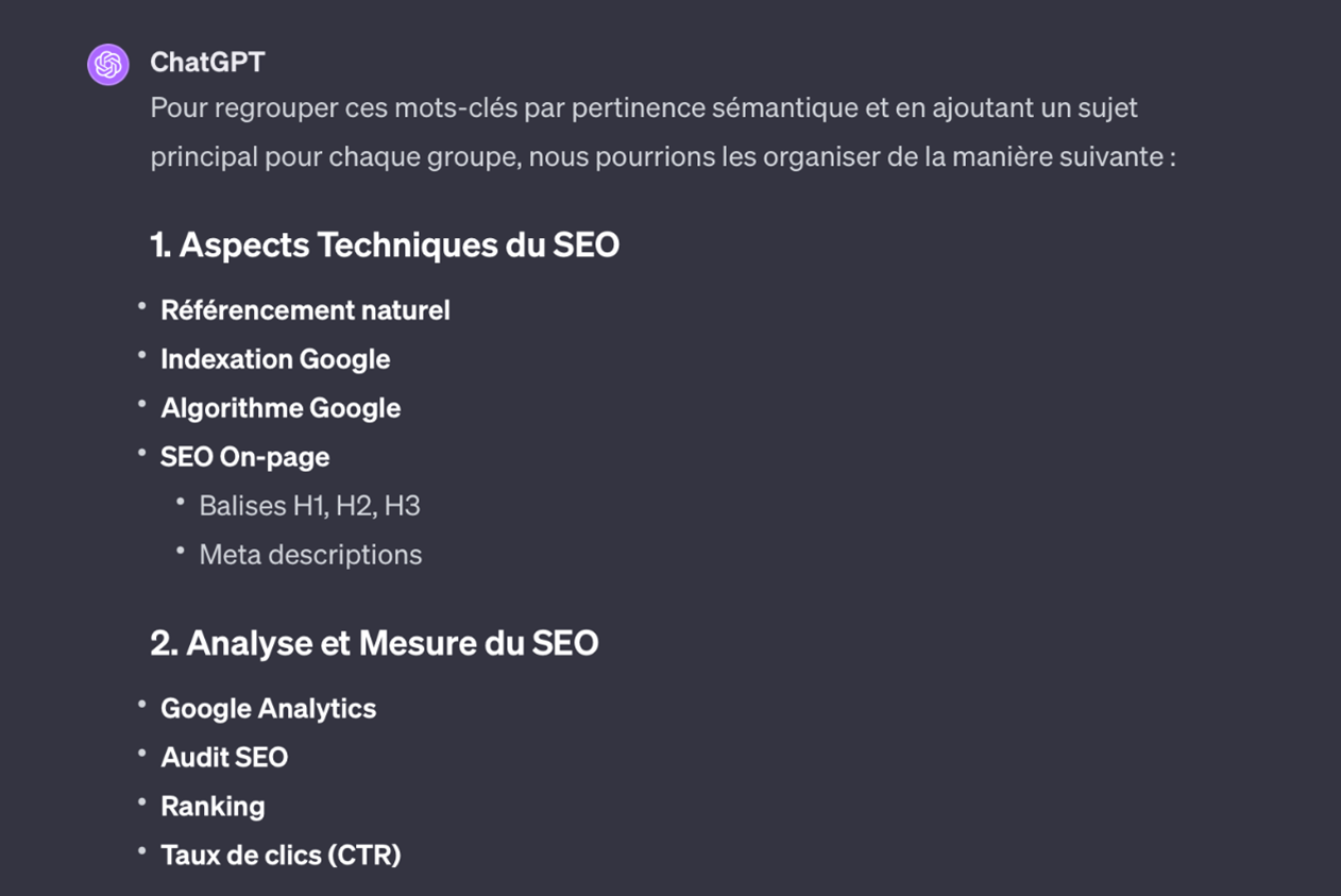Le prompt est assez simple : « Regroupe les mots-clés suivants (en ajoutant un sujet principal pour chaque groupe) en fonction de leur pertinence sémantique : {votre liste de mot-clé} »