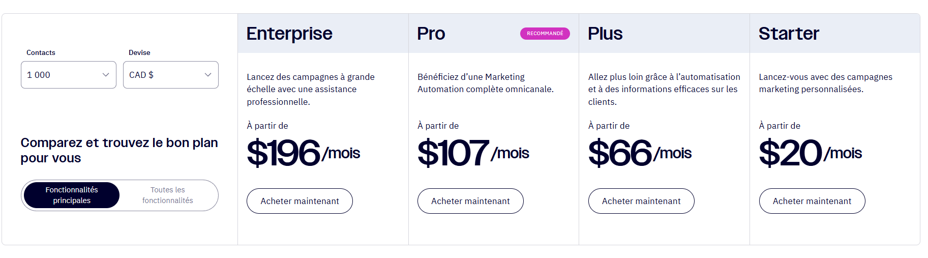 Points forts : Focus sur l’automatisation des campagnes email, avec un excellent rapport qualité-prix. Il propose des fonctionnalités comme les scénarios d’automatisation avancés, la segmentation et le lead scoring.