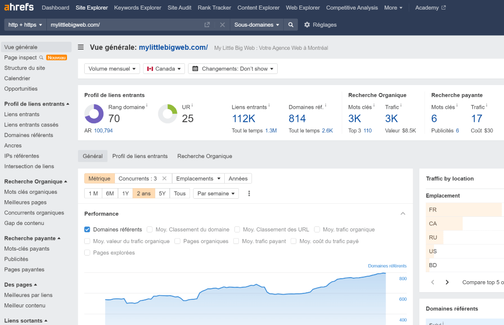 Ahrefs propose une métrique appelée Domain Rating (DR) qui, comme la DA, évalue la qualité des backlinks d’un site sur une échelle de 0 à 100. L’outil offre une analyse en profondeur des backlinks et des mots-clés, ce qui est vital pour toute stratégie visant à améliorer l’autorité de domaine et le référencement naturel de votre site.