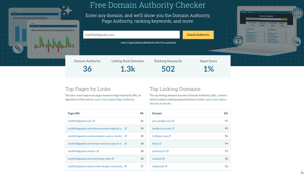 Néanmoins, il existe un excellent moyen de savoir si votre site Internet a une chance d’être bien positionné sur les moteurs de recherche : l’autorité de domaine. L’autorité de domaine est un score de 0 à 100 qui peut prédire si un site Web va être bien référencé ou non. Bien sûr, il ne s’agit que d’un indicateur et avoir une bonne autorité de domaine ne suffit pas pour bien positionner son site.