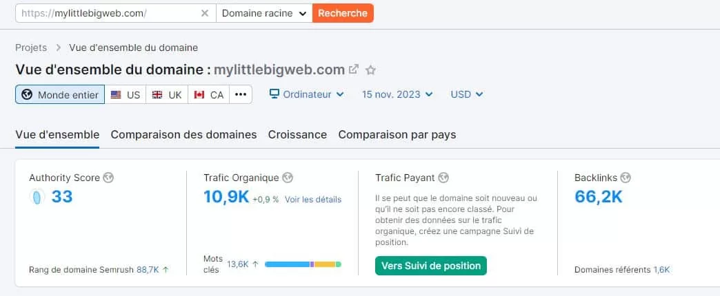 - Potentiel de croissance : avec une forte autorité de domaine, le potentiel de croissance de votre site est amplifié. Par conséquent, la capacité à ranker pour des mots-clés compétitifs augmente, ouvrant ainsi la porte à une visibilité accrue et à un trafic organique plus important.