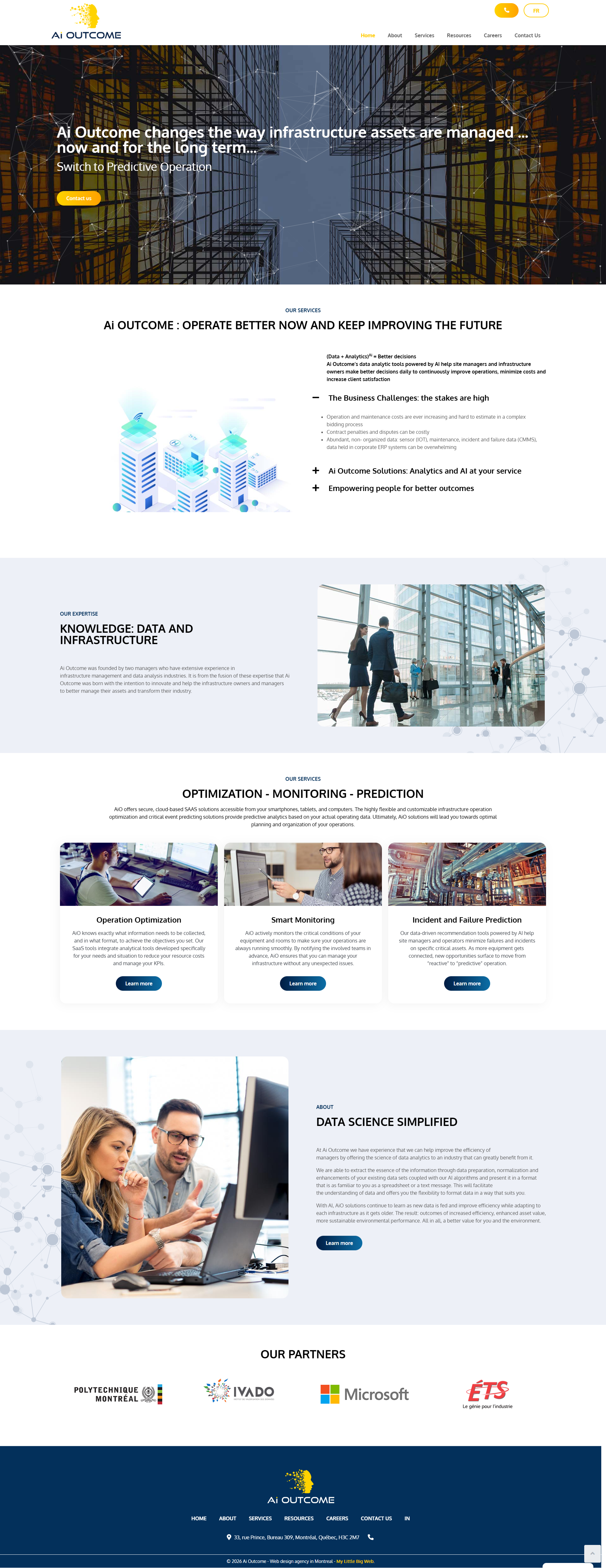 AI Outcome est une start-up technologique spécialisée dans l’optimisation des infrastructures grâce à la data science et à l’intelligence artificielle. L’entreprise accompagne les propriétaires et exploitants d’infrastructures pour réduire les coûts, améliorer les performances et minimiser leur impact environnemental, en transformant leurs données en solutions opérationnelles et durables.