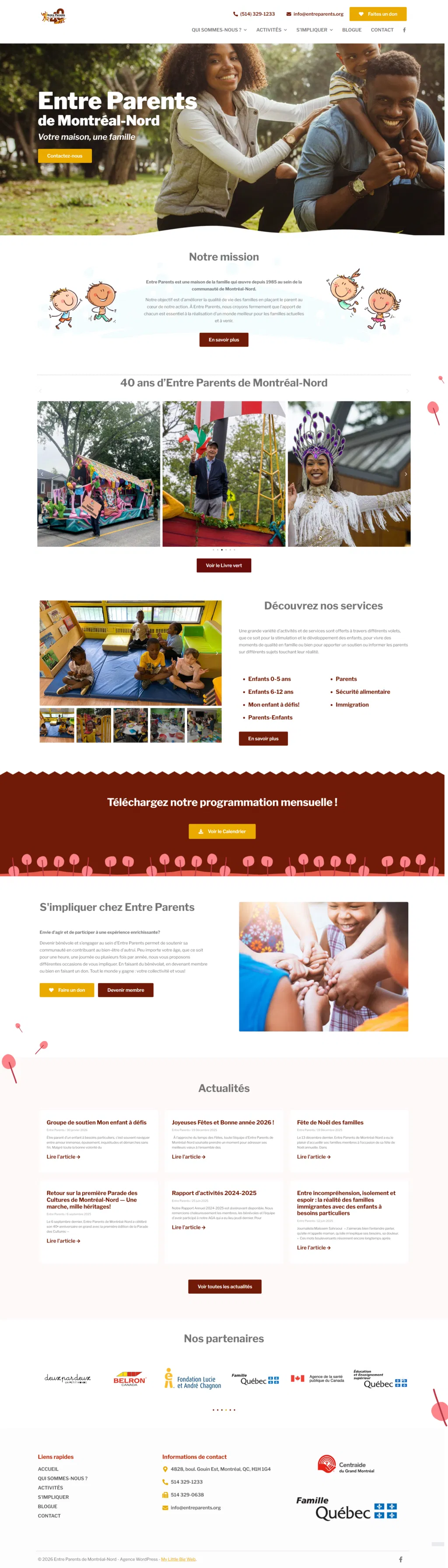 Depuis 1985, Entre Parents agit comme une maison de la famille au cœur de Montréal-Nord, avec une mission claire : améliorer la qualité de vie des familles en plaçant les parents au centre de son action. Convaincue que chaque contribution compte, l’organisme s’engage à bâtir un avenir meilleur pour les familles d’aujourd’hui et de demain.