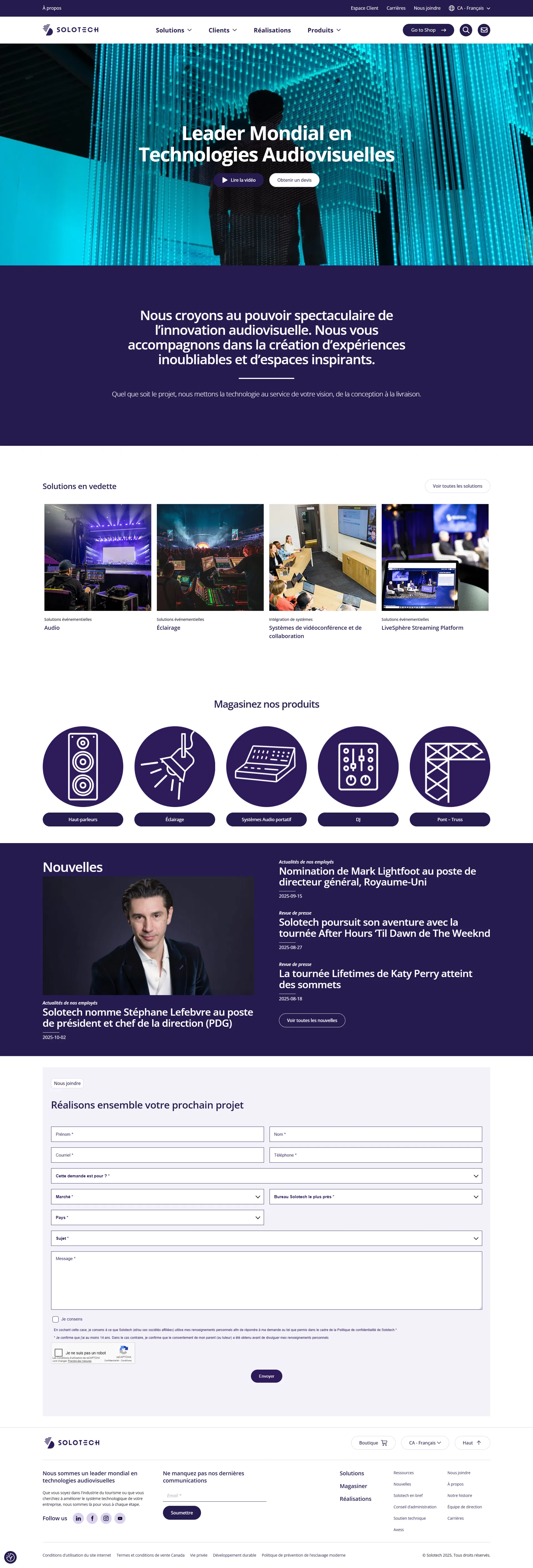 Avant notre intervention, le site de Solotech ne reflétait pas pleinement la portée de son expertise ni la richesse de ses solutions intégrées. L’objectif : moderniser la présence en ligne, clarifier l’offre et renforcer la visibilité SEO autour de ses piliers : intégration audiovisuelle, événements et technologies connectées.