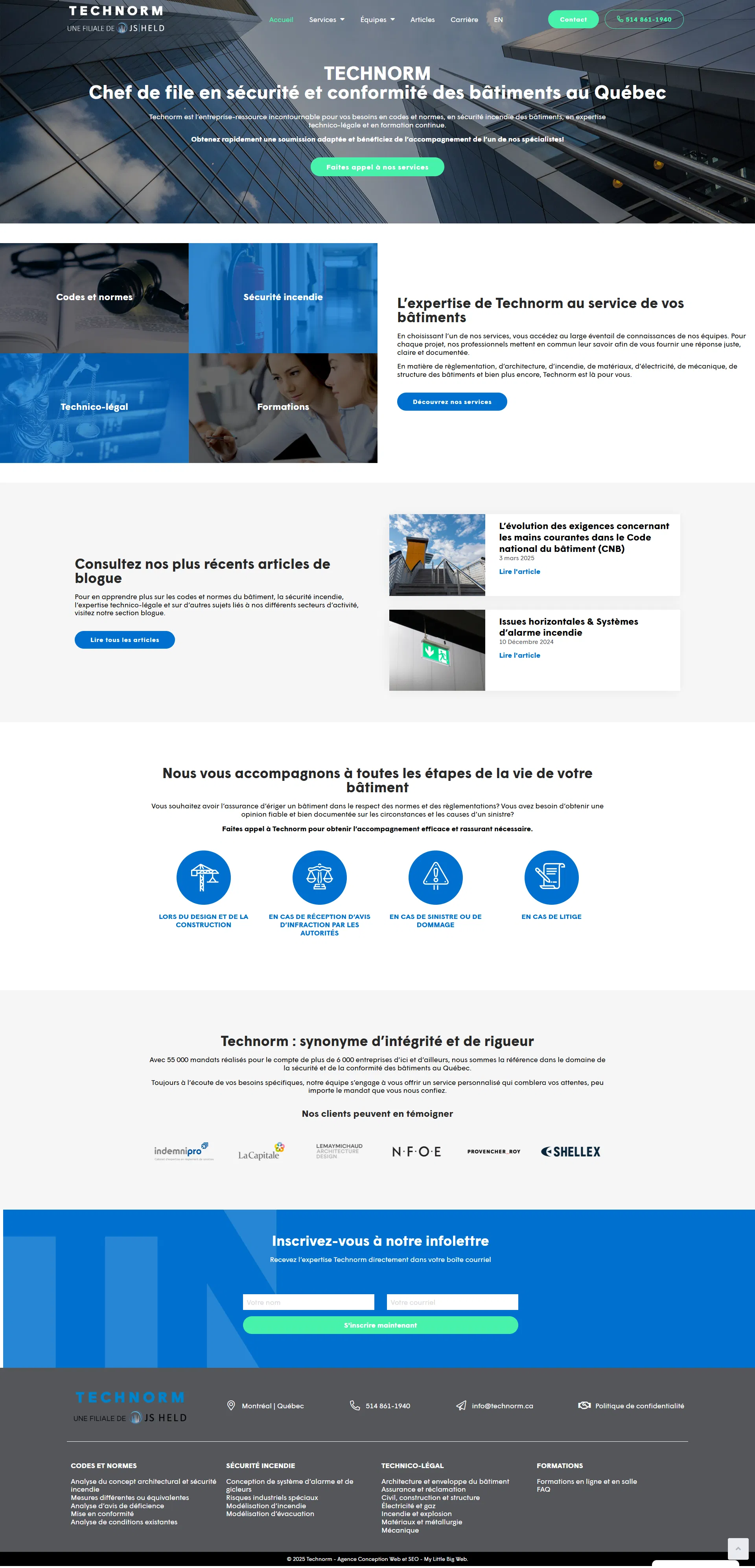 Avant notre intervention, le site web de Technorm ne traduisait pas pleinement l’étendue de ses services spécialisés ni sa crédibilité dans un domaine hautement technique. L’objectif était de moderniser son empreinte digitale, de rendre l’interface plus claire et accessible, et d’optimiser la visibilité sur ses axes d’expertise : codes et normes, sécurité incendie, expertise légale et formation continue. La refonte complète a abouti à un site responsive, performant et optimisé pour le SEO, capable de valoriser ses multiples services et de positionner Technorm comme la référence en conformité des bâtiments au Québec.