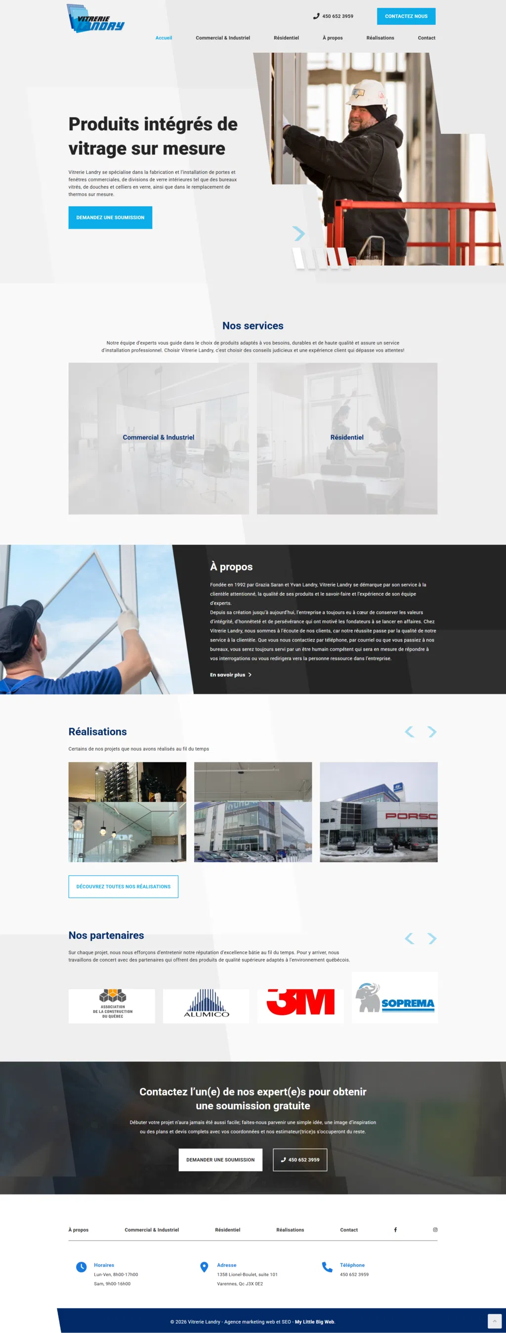Vitrerie Landry est votre spécialiste en fabrication et installation de solutions en verre sur mesure pour les espaces commerciaux et résidentiels. Que ce soit pour des portes et fenêtres commerciales, des divisions intérieures en verre comme des bureaux vitrés, ou encore des douches et celliers en verre, ils offrent des produits durables, esthétiques et performants. Leur expertise s’étend également au remplacement de thermos sur mesure, garantissant précision et qualité pour chaque projet.